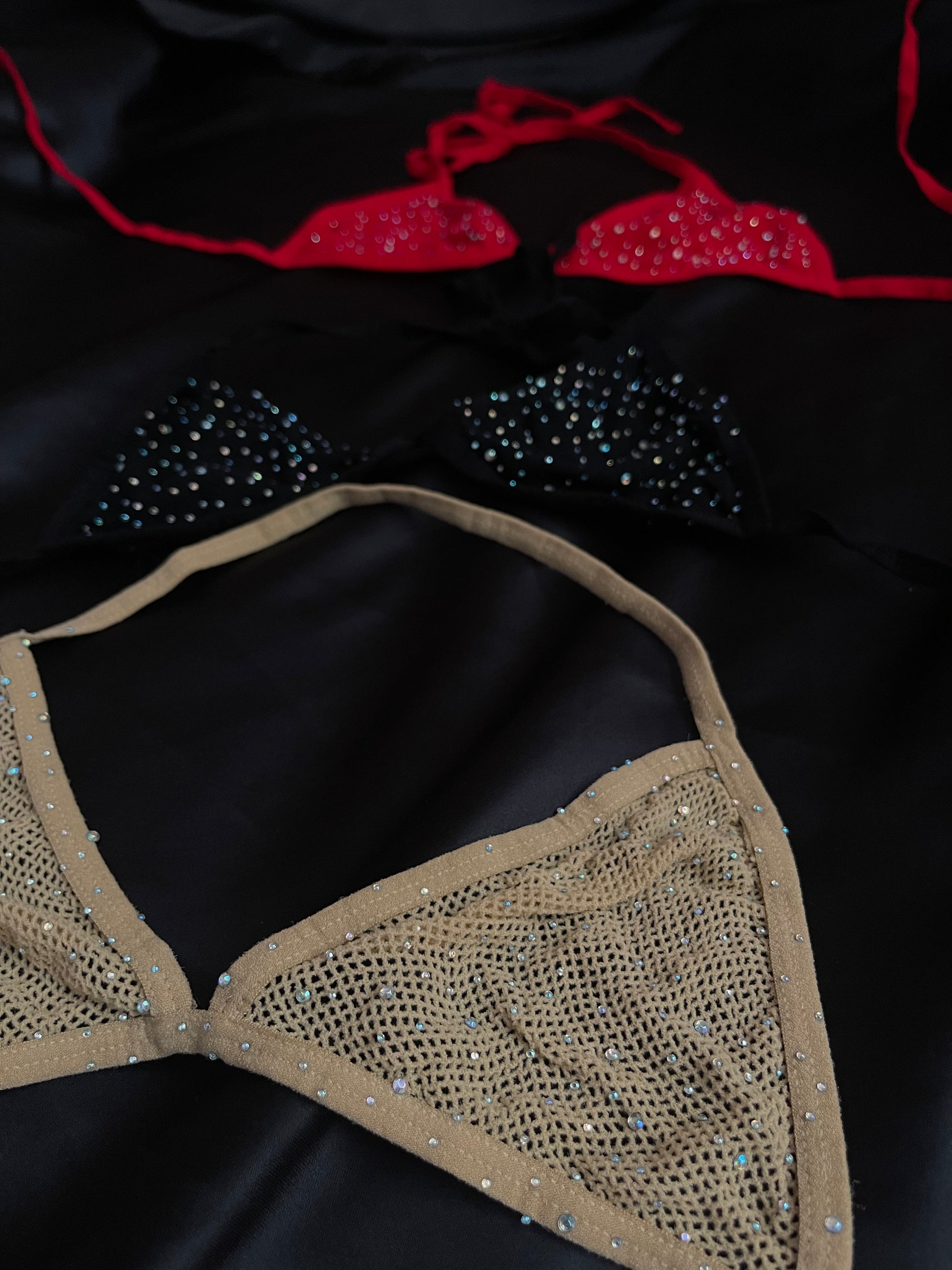 Tops en tela spandex. Estira hasta Copa C aproximadamente. Diamantitos de detalles y amarres en lazos.
