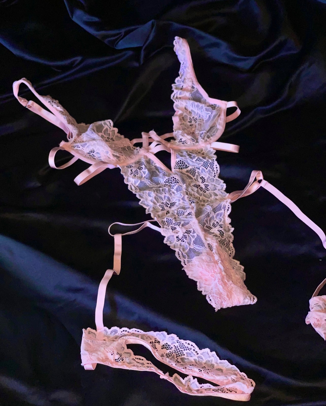 Enterizo en tela de encajes y tiras en elástico. Expande bastante y se ajusta a gusto en todas partes. Una pieza muy romántica por su color y suuuper sexy.